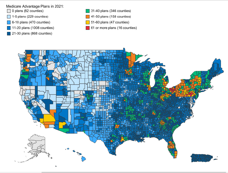 PPOs can be offered in the same areas as HMO plans, but also expand to more rural areas and can even be offered statewide. The image slide below shows the number of Medicare Advantage plans offered by county in 2021. As you can see, the major metro areas have a higher concentration of plans offered compared to the rural counties. As you can see, there are 82 rural counties across the country that do not have any Medicare Advantage plans available.